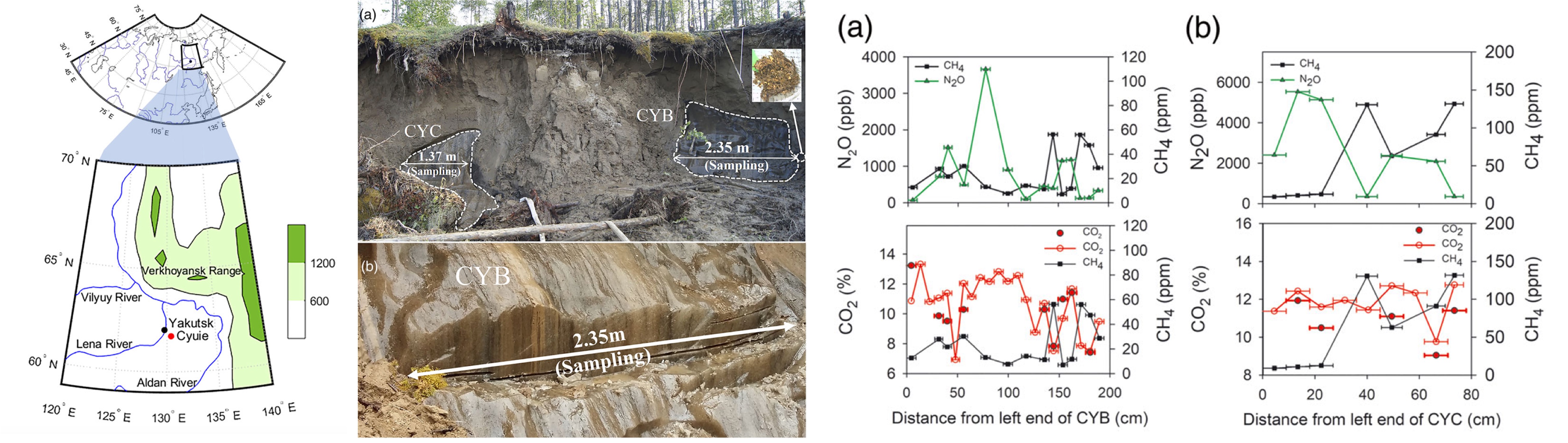 Most of the land in the high latitude region of norhtern hemisphere (Siberia, Alaska, Scandinavia or Northern Canada) consist of Permasfrost. Permafrost have active layer in the surface which melt in summer and frozen in winter, but it perennially frozen under that layer which means ice can survive several years or even tens of thousands of years from last ice age. One of the most common type of ice observed in permafrost is ice wedge which developed in wedge-shape. Analysis of ice wedge can give us information regarding Paleoclimate because it survive through geological time. The gas chemistry of ice wedge is also important to investigate because significant of permafrost will expect to melt due to the climate change and it will emit additional greenhouse gas to the atmopshere. The fieldwork of coring ice wedge sample was held in 2015 summer with the cooperation of SNU and Melnikov Permafrost Research Institute at central Yakutia. The CO2 concentration observed as 7 - 13 % and CH4 concentration observed as 7 - 131 ppm in ice wedge at Cyuie Village. The N2O concentration, which is first measured in my research, show 64- 5500 ppb. The formation of CO2 and CH4 likely due to the biological respiration, which implies microbial activity in sub-zero temperature. The high variability of N2O concentration implies both consumption and generation procedure within the ice wedge.